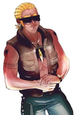 - Pyrite is a very tall middle-aged father with a particularly buff and muscular frame. He's most notably known for his set of strawberry blond cornrows bound at the end with three rows of white plastic beads, and his pair of thick rimmed black wayfarer sunglasses. He is usually seen wearing a brown leather motorcycle vest, denim cargo pants held up with a bronze buckled belt, dark brown steel-toe work boots and a bear-claw corded necklace. He also has a gold rimmed, leather banded watch on his left wrist and a gold earring in his left ear. Pyrite's extreme height may be caused by some form of gigantism or pituitary problem as it is not seen in anyone he's related to, and is beyond the realm of normalcy. Most notably, apart from his height, Pyrite is set apart by his thick eyebrows and sideburns. Pyrite also wears the Philippine flag across his torso in the form of a tattoo, along with the spiraling words "Love eternal" written in the Baybayin alphabet* on his right bicep. His final tattoo is that of a full colour lotus flower on his lower back. His eyes have an epicanthic fold and a particularly aged look to them; he is often cited as wearing his sunglasses to hide his 'crow’s feet.' Pyrite and his son share the same deep brown eye colour.